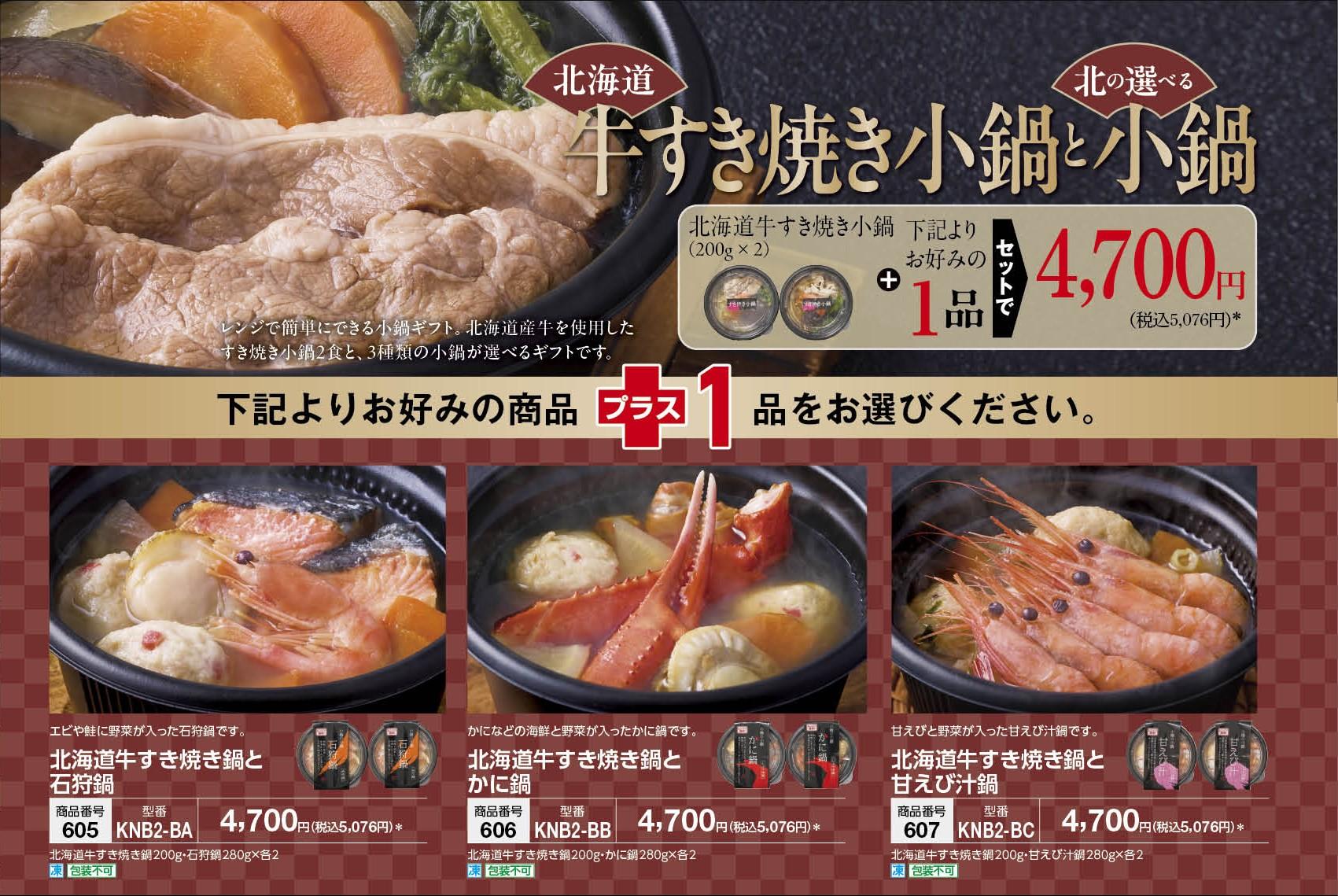 「ごちそう三段重」は12種類の年末年始に欠かせない商品の中から3品をひとまとめにして贈るギフトです。また「牛すき焼き小鍋と北の選べる小鍋」は冬の人気料理「すき焼き小鍋」にプラスして3品の中から1品選んで組み合わせて贈るギフトです。「ずわい蟹と選べるギフト」は、ボイルずわい蟹にプラスして3品の中から1品を選んでを組合せて贈るギフトです。リーズナブルで「選ぶ楽しさ」も組み合わせた、今の時代にマッチした商品です。